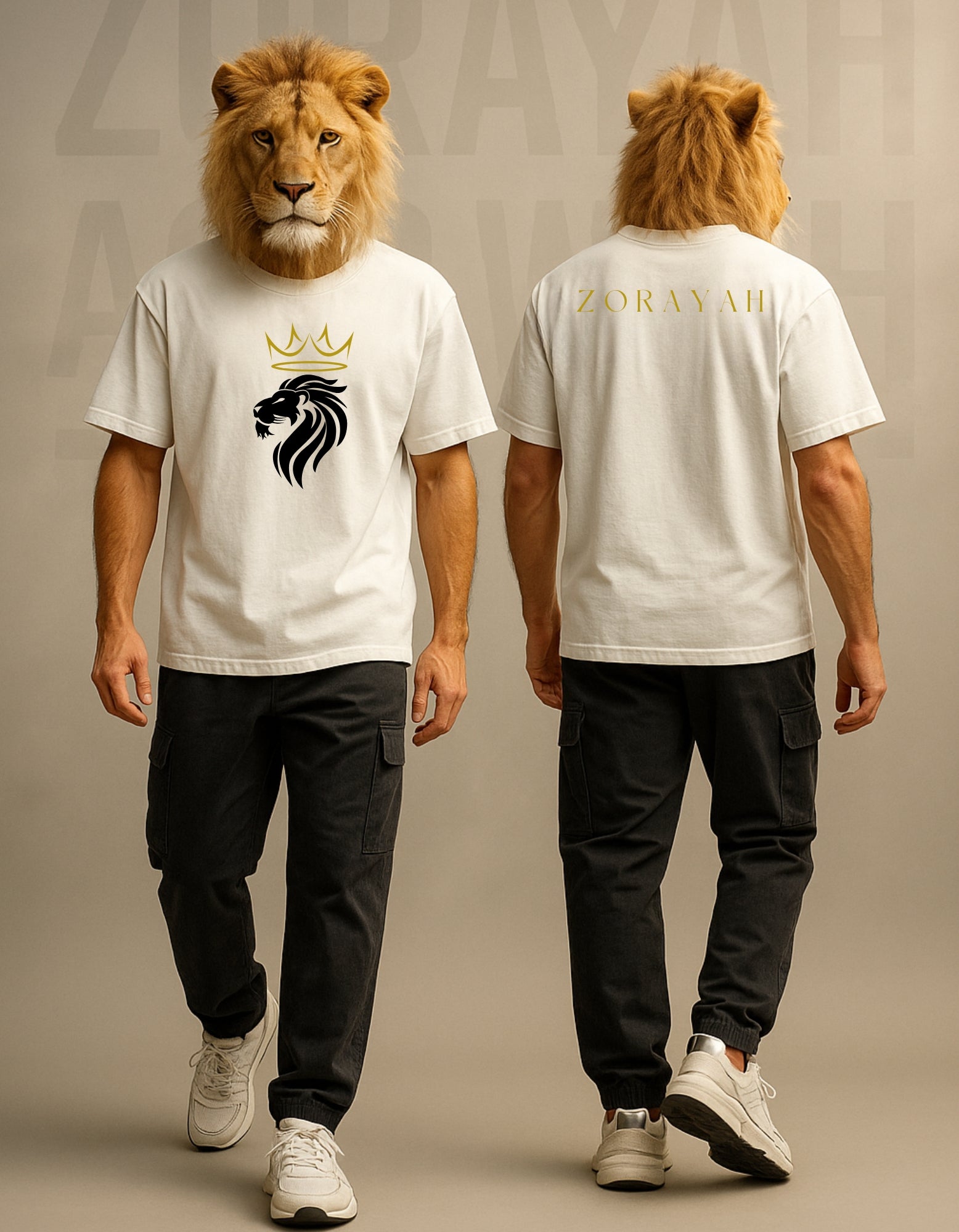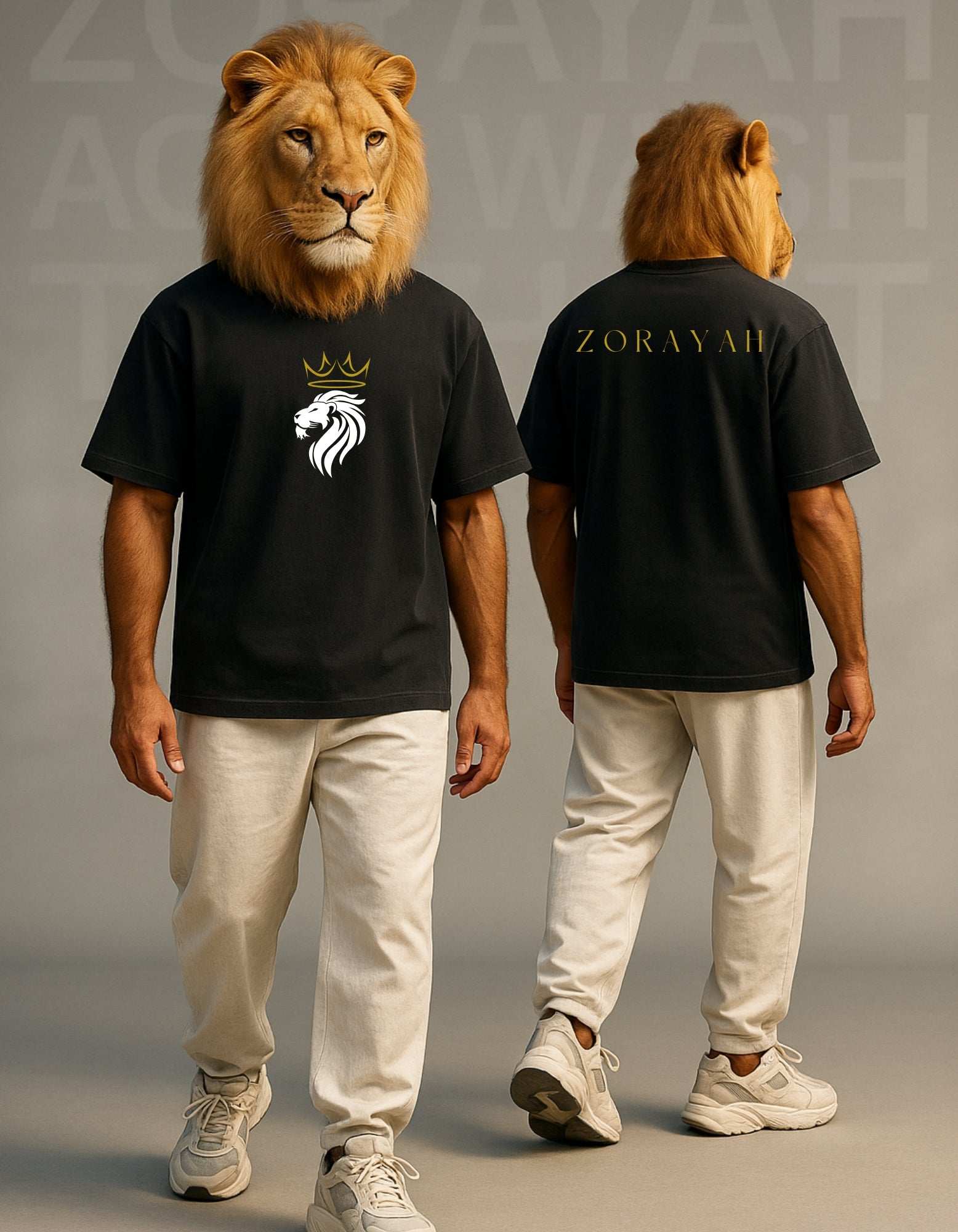The ZORAYAH Signature Crown Logo Tee is more than a t-shirt β itβs the face of the movement. Featuring a bold white lion with a golden crown on the front and the signature ZORAYAH branding on the back, this oversized t-shirt is your invitation to walk with royalty.